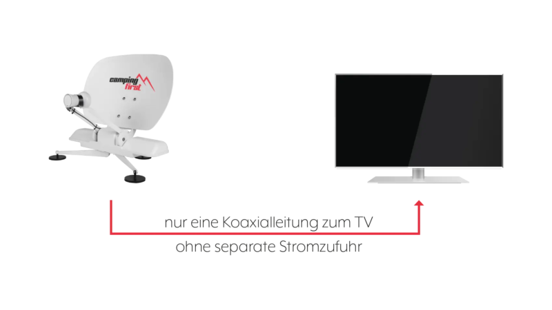 Die Inbetriebnahme der Satmex mobil 3 ist besonders unkompliziert. Es wird nur eine Koaxialleitung zum Fernseher oder Satelliten-Receiver benötigt – eine separate Stromversorgung ist nicht notwendig. Die Antenne wird direkt über das angeschlossene Gerät mit Strom versorgt.